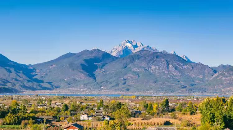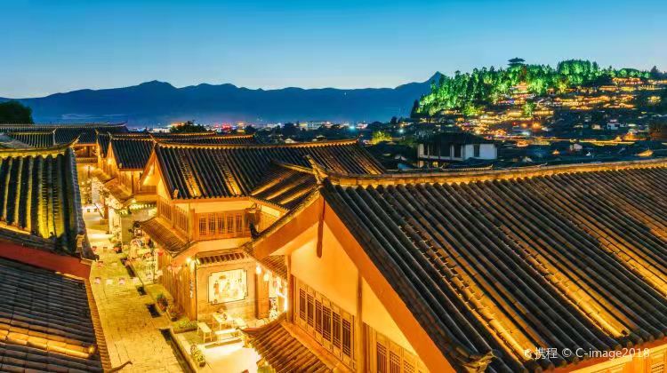 落日熔金,丽江古城被神秘的橘红色的柔辉层层包裹着,天半参差的山雪浸染着烁烁红晕,绽放高空,像一朵魅力四射的玫瑰。