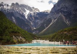 白水河是玉龙雪山脚下的一条河流,由雪山融水形成,因为水质非常清澈,流经过一段河床、台地都是白色岩石的地方,水也仿佛成了白色,因此得名。白水河流经玉龙雪山山脊的蓝月谷时颜色五光十色,非常奇幻漂亮,仿佛白色的宣纸上浸了彩。
